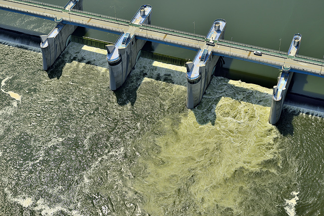 경남 창녕군 함안보 수문을 열자 강을 덮은 녹조가 흘러가기 시작했다 Ⓒ신병문