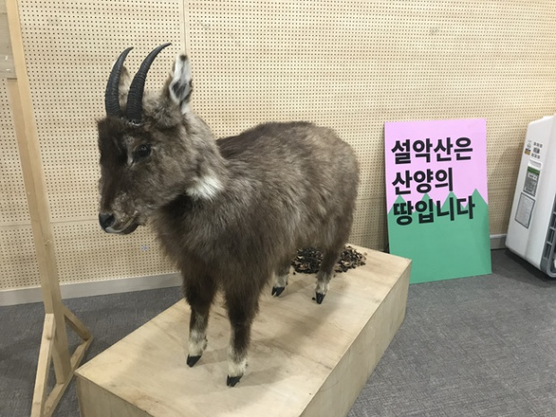 지난 11월 17일 창비 50주년 기념홀에서 ‘설악산 산양이 제기한 케이블카 중지소송 모의법정’이 열렸다. 법정 입구에 전시된 산양은 경북 울진에서 탈진된 채 발견되었다가 숨져 박제한 산양이다 ⓒ박은수