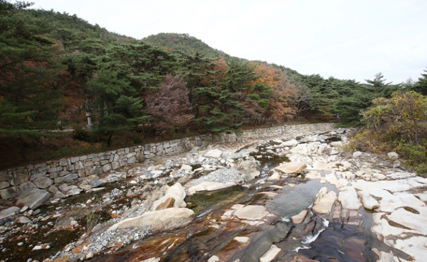 무풍한송길의 솔들은 대부분 금강송. 그러나 굳이 곧게 높게 기르려고 노심초사하며 가꾸지 않고, 햇빛과 바람을 따라 제 뜻대로 휘어지며 자라는 것을 허락한 덕에 금강송들은 사람과 물과 차가 다니는 길의 허공을 꿈틀거리며 뻗어나가 넉넉한 줄기와 가지로 덮고 있다. 솔 그늘 아래로 솔바람이 불고, 통도천 계류가 천천히 흘러내리고, 사람들 또한 느릿하게 오르내린다. 찻길의 서행하는 차들은 가속페달조차 밟지 않는다. 무풍한송길을 오르노라면 곳곳에 불심으로 봉헌한 석등들이 서있다. 어두울 녘 등을 켜들고 숲을 비출 것이다. 느릿하게 걸어도 30분이면 ‘영축총림(靈鷲叢林)’이란 큰 편액을 달고 선 총림문을 볼 수 있다. 여기까지가 무풍한송길이다.