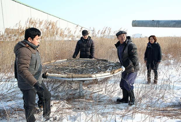 오늘은 황새가 자주 출몰하는 서산 천수만 일대 황새들의 자연번식을 돕기 위해 김신환 원장과 윤종민 한국교원대학교 황새생태연구원 박사가 수차례 조사 후 최적의 조건을 찾은 서산시 하수처리장 내 해미천변 갈대밭에 인공둥지를 설치하는 날이다. 직경 2미터, 높이 13미터의 철골조 인공둥지다. 황새가 워낙 대형조류라 둥지도 규모가 있다. 2년 전 서산버드랜드 인근 논에 세워진 1호 인공둥지보다 번식에 성공할 확률을 높였다는 게 이들의 자평이다.