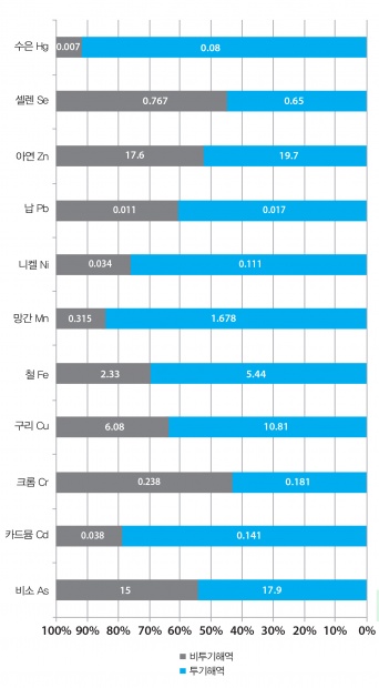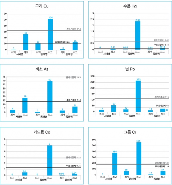 (*2014년 조사된 배출해역 퇴적물의 중금속 농도, 단위 mg/kg 건중량)