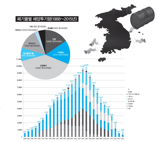 1988년부터 2015년까지 28년 동안 3개 투기해역의 바다에 버려진 육상폐기물의 총량은 1억3388만1000톤이다. 폐기물 종류별로 보면 산업폐수가 전체의 40퍼센트(5335만8000톤)로 가장 많았다. 이어 인분 16퍼센트(2098만4000톤), 가축분뇨 15퍼센트(2077만3000톤), 하수오니 13퍼센트(1764만1000톤), 음식폐기물 9퍼센트(1161만2000톤)의 순서로 많았다. 연도별 투기양의 종류 변화를 보면, 1988년부터 3년간 산업폐수가 유일하게 버려지다가 이후 여러 종류의 폐기물이 버려지는 동안에도 산업폐수는 2004년까지 매년 가장 많이 버려지는 폐기물 종류였다. 2005년부터 2008년까지는 축산분뇨가 가장 많이 버려졌고, 이후 2012년까지는 여러 종류가 비슷하게 버려지다가 2013년부터 3년간 다시 산업폐수가 가장 많이 버려졌다. 이를 보면 대한민국 해양투기는 기업들의 폐기물 처리를 위해 시작되었고 산업폐수가 가장 많이 오랫동안 버려졌고 마지막 2년의 금지유예조치도 산업폐수 투기에만 적용되었다. 동해와 서해바다는 28년간 기업들의 폐수처리비용을 줄이기 위해 희생된 폐수처리장이었다. 준설물은 하수도와 항만의 청소준설물과 항로유지 항만공사 등에서 발생하는 유지기준준설물 두 종류가 있다. 정부는 2007년까지 두 종류의 준설물을 모두 투기양 통계에 포함하다가 이후부터는 유지기준준설물만 통계에서 제외하고 있다. 오염이 심하지 않고 다른 나라들도 버리고 있다는 이유에서다. 그러나 유지기준준설물도 오염된 상태이고 런던협약에서도 육지처리를 권고하고 있다는 점에서 환경운동연합 바다위원회의 해양투기 통계에 포함하여 분석했다. 정부는 2007년 이후부터 청소준설물은 해양에 버리지 않지만 유지기준준설물은 계속 투기하고 있고 2016년부터의 전면금지에서도 제외되어 있다. 투기양의 단위는 1000세제곱미터인데 이해를 돕기 위해 모든 폐기물의 비중을 1로 보고 1000톤으로 환산했다.