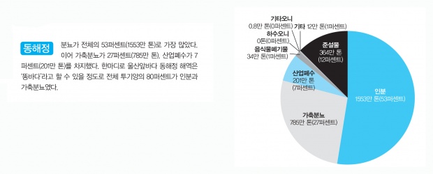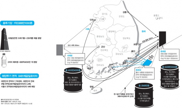동서남해 어느 바다 어느 해역에 버렸으며 그 바다는 얼마나 오염됐는가?