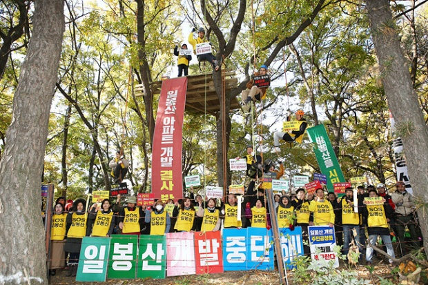 지난해 11월 일봉산 개발저지를 위해 서상옥 천안아산환경운동연합 사무국장이 나무 위 농성을 진행했다 Ⓒ함께사는길 이성수