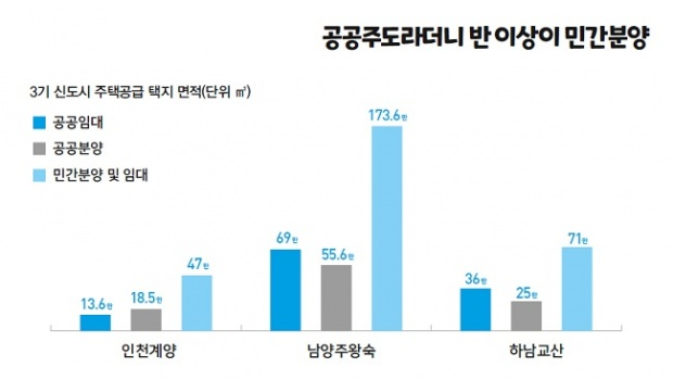 참여연대가 국토부 고시를 토대로 분석한 바에 따르면, 3곳의 신도시 전체 주택 공급 용지의 절반 이상이 민간에 매각하는 것으로 확인된다. 인천계양 시도시의 경우 전체 주택공급 용지 가운데 민간에 매각되는 택지 비율은 59%에 달하고 남양주왕숙 공공택지도 58%, 하남교산은 54%가 민간에 매각된다. 민간사업자에게 매각된 공공택지는 인천계양 신도시에서 7618호, 남양주 왕숙 신도시에서 3만987호, 하남교산 신도시에 서 1만3329호가 민간분양아파트로 공급될 예정이다. 참여연대는 이를 통해 민간사업자가 가져가는 개발이익이 최대 5조6천억 원에 달할 것으로 추정했다. 공공분양 역시 10년 후 주변 시세에 따라 분양되는 주택이므로 실제 공공의 몫은 전체 공공택지 중 23.3%에 불과한 셈이다.