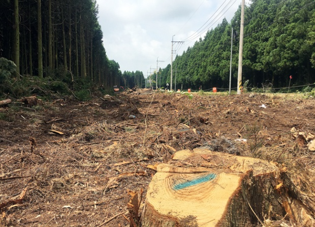 상당수의 삼나무가 잘려나간 비자림로