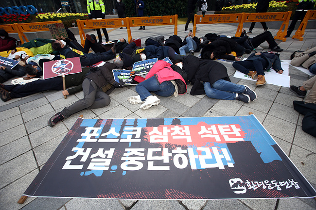 지난해 12월 150여 명의 시민들은 석탄발전 중단을 촉구하며 삼성 본사 앞에서 포스코 본사 앞까지 거리 행진을 펼쳤다 ⓒ함께사는길 이성수
