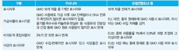 우리나라는 매년 국민 1인당 식용 GMO 44kg를 들여오는 세계 1위 GMO 수입국가입니다. 주로 수입하는 GM옥수수로는 전분당(올리고당,과당,물엿)과 식용유(옥수수유)를 만들고, GM콩으로는 대부분 식용유(대두유)를 만듭니다. 옥수수와 콩을 직접 먹지 않더라도 GMO 식용을 피하기 쉽지 않습니다. 상황이 이런데 현행 GMO표시제도는 불완전하기 짝이 없습니다. 가공식품의 경우 잔류단백질이나 DNA가 남아있지 않으면 GMO를 원재료로 썼더라도 표기의무가 없어 결국 소비자는 GMO 여부를 확인할 수 없는 형편입니다.