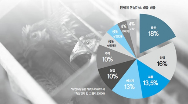 『축산업의 긴 그림자』(FAO, 2006)에 의하면 생태계에 가장 큰 영향을 미치는 축산업은 생물다양성 파괴, 지구온난화, 대기오염, 토지 황폐화, 산림 파괴, 물 부족, 수질오염의 주범으로 드러났습니다. 인간의 탐욕이 불러온 과도한 육식이 지구의 지속가능성을 위협하고 있음을 증명합니다.
