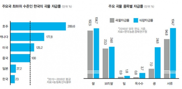 현재 5억 명이 식량을 구하기 힘든 사막화 지역에 거주중이고 인류의 10% 이상은 영양부족을 겪고 있습니다. 기후위기가 식량위기를 부르는 현실에서 2015~2018년 한국의 평균 곡물자급률(사료 포함)은 23%로 경제협력개발기구(OECD) 34개 회원국 중 최하위인 32위에 불과하고 사료를 제외한 식용 곡물 자급률도 48.9%밖에 안됩니다. 쌀을 제외한 곡물 대부분을 수입에 의존하고 있어 향후 국제 곡물 가격이 폭등할 경우 식량위기에 직면할 수밖에 없습니다. 단지 농민의 소득감소가 문제가 아니라 국민의 식량 확보가 문제가 되는 ‘기후위기로 인한 식량위기 시대’입니다. 최선의 대비책은 식량(먹거리)의 해외 의존도를 낮추고 국내 자급률을 높이는 것입니다.