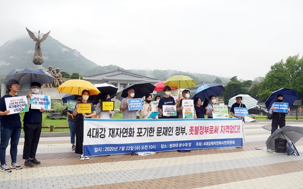 7월 22일 청와대 분수대 앞에서 4대강 재자연화시민위원회는 4대강 재자연화를 포기한 문재인 정부에 대한 규탄 기자회견을 열었다 ⓒ 환경운동연합