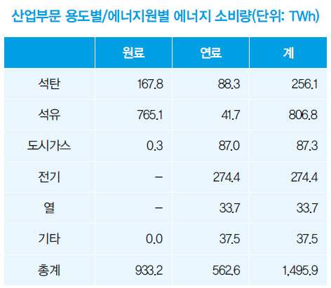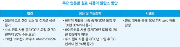 원료로 사용되는 화석연료를 대체하는 것은 업종별 특성에 따라 다르게 접근할 필요가 있다. 철강, 석유(정유 및 석유화학), 시멘트 업종은 화석연료를 원료로 사용하는 대표적인 업종으로, ‘2018 산업부문 에너지사용 및 온실가스 배출량 통계’에서는 이들 산업이 배출하는 온실가스가 산업부문 전체의 75%, 에너지 소비는 85%에 달하는 것으로 조사됐다. 국내 에너지 소비와 온실가스 배출에 지배적인 영향을 미치고 있기 때문에 이들 산업의 감축이 산업부문의 탈탄소에서 가장 중요하다. 다음은 원료 대체를 위해 각 산업의 에너지 소비 특성을 소개하고, 시나리오에서 적용된 온실가스 감축 방안을 설명한다.