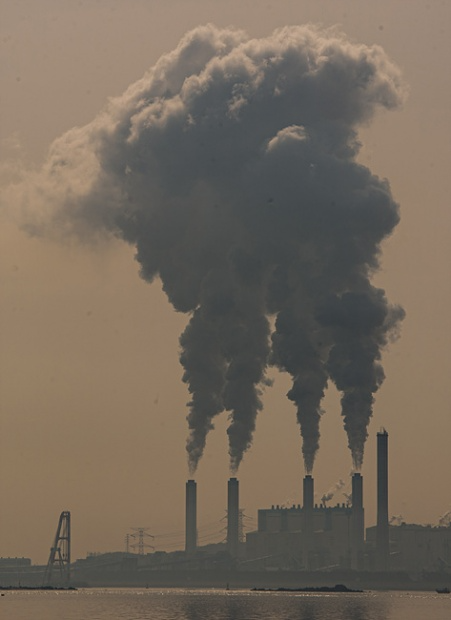 경기도 육도에서 멀리 충남 당진의 화력발전소에서 뿜어대는 수증기가 을씨년스럽게 보인다. 화석연료에 의존하는 화력발전소는 지구의 온도를 높이는 주범인 이산화탄소를 대량 배출한다