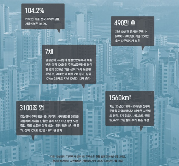 7채 경실련이 국세청과 행정안전부에서 제출받은 상위 100분위 주택보유현황을 분석한 결과 2018년 기준 상위 1%가 보유한 주택 수. 2008년에 비해 2배 증가. 상위 10%는 3.5채로 지난 10년간 1.2채 증가