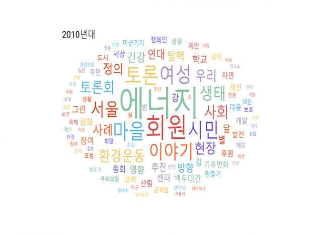 2010년대에는 ‘에너지’가 가장 많이 등장한 단어였습니다. 이와 함께 ‘회원’, ‘마을’, ‘여성’, ‘시민’, ‘이야기’ 등의 단어들이 높은 빈도로 보이는데, 이로써 환경운동이 시민의 일상으로 들어가 다양한 주체와 함께 논의되고 있음을 확인할 수 있습니다.