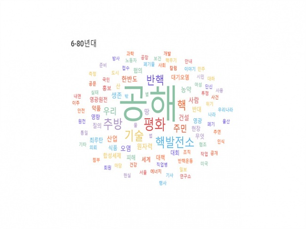 1980년대 이전에는 공해, 반핵과 평화, 핵발전소, 추방, 땅, 생존 등의 단어가 주요했습니다. 1971년 11월 착공이 시작된 고리원자력발전소를 시작으로 핵발전소 반대 운동이 시작되었으며 이와 함께 공단 조성 등으로 인한 ‘공해’와 ‘생존’의 문제가 대두되었음을 알 수 있습니다.