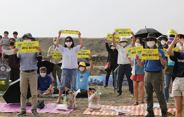 2020 환경운동연합 전국 회원대회가 새만금 해창갯벌에서 열렸다. 코로나19 거리두기 방침에 따라 온라인으로 개최된 이번 회원대회는 새만금을 그리워하는 회원들에게 메시지를 받아 환경연합 활동가들이 대신 새만금 갯벌에 펼치고 도요새 조형물을 만들어 세웠다