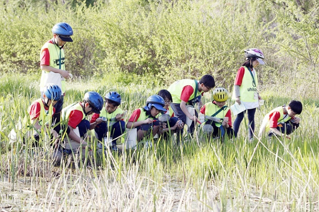 초등학생들이 자연환경 현장에 나와 수생생물에 대한 교육을 받고 있다 Ⓒ함께사는길 이성수