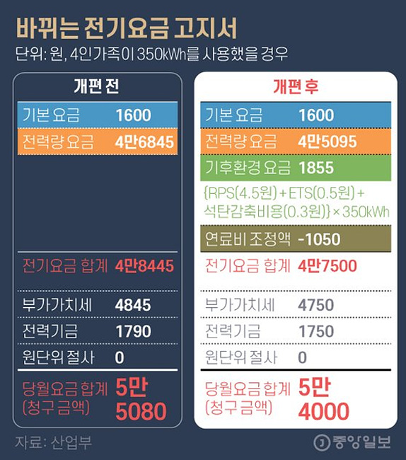 2020년 12월 17일 산업통산자원부와 한국전력이 2021년 1월 1일부터 시행될 전기요금 개편안을 발표했다. 전력 생산에 사용되는 발전연료의 비용 변동을 전기요금에 반영하겠다는 것이 골자다. 여기에 석탄화력발전의 신속한 퇴출비용 등을 지원하는 요목을 추가했고, 전력 저소비 에너지 취약가구를 위한 ‘필수사용 공제제도’ 개선책도 담았다. 기존 전기요금 고지서를 보면 기본요금, 전력량 요금(기준연료비용+연료비 변동비용+기후환경비용+기타)으로 이원화돼 있다. 연료비 변동비용과 기후환경비용이 전력량 요금 안에 숨겨진 형태인 것이다. 개편안은 전력량 요금에 숨겨졌던 연료비 변동비용과 기후환경비용을 분리해 전기요금 고지서에 드러나도록 표기하겠다는 것이다.