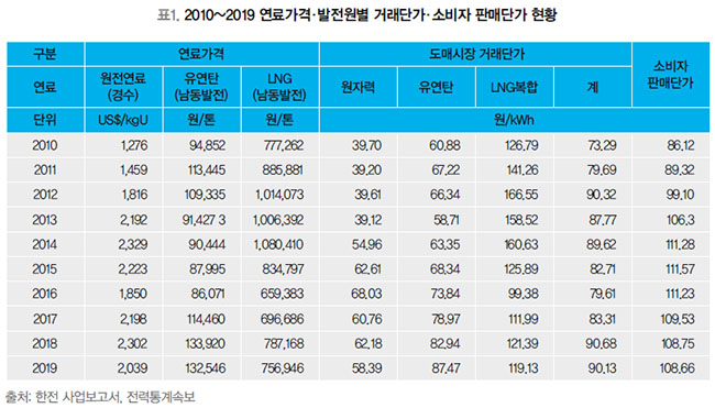 현행 전기요금의 문제는 크게 4가지로 정리할 수 있다. 먼저 발전연료의 시장가격 변동이 전력판매가격에 반영되지 않는다는 점이다. 표1을 보면 발전연료가격, 도매시장 전력거래단가, 소매 전력판매단가가 연동되지 않고 각기 변동돼 왔음을 알 수 있다. 발전연료가격이 하락하자 당연히 도매시장 거래단가도 하락했는데 이상하게 소매 판매단가는 상승(2012~2016년)했다. 반면 발전연료가격이 하락했는데 도매시장의 거래단가는 인상되고 또 그와 반대로 소매 전력판매단가는 하락(2016년)하는 일이 발생했다. “연료비용이 전기요금에 반영되기는커녕 역방향으로 작용하는 경우가 허다.”(박광수, 「에너지정책과 전기요금 합리화 방향」, 2020.9.2.)했던 것이다.