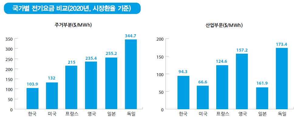 전기요금 인상을 둘러싼 민감도에 비해 실제 요금 부담에 대한 체감도는 낮은 편이다. 한국의 전기요금은 다른 국가에 비해 낮은 편이다. 2020년 기준 한국의 주택용 요금은 메가와트시(MWh)당 103.9달러다. 경제협력개발기구(OECD) 37개 회원국 중 네 번째로 저렴하다. 한국보다 싼 나라는 멕시코, 노르웨이, 터키로, 모두 산유국이거나 발전 연료가 안 들어가는 수력과 재생에너지 비중이 높은 나라들이다. 반면 독일은 345달러, 일본은 255달러로, 한국보다 2~3배 비싸다.