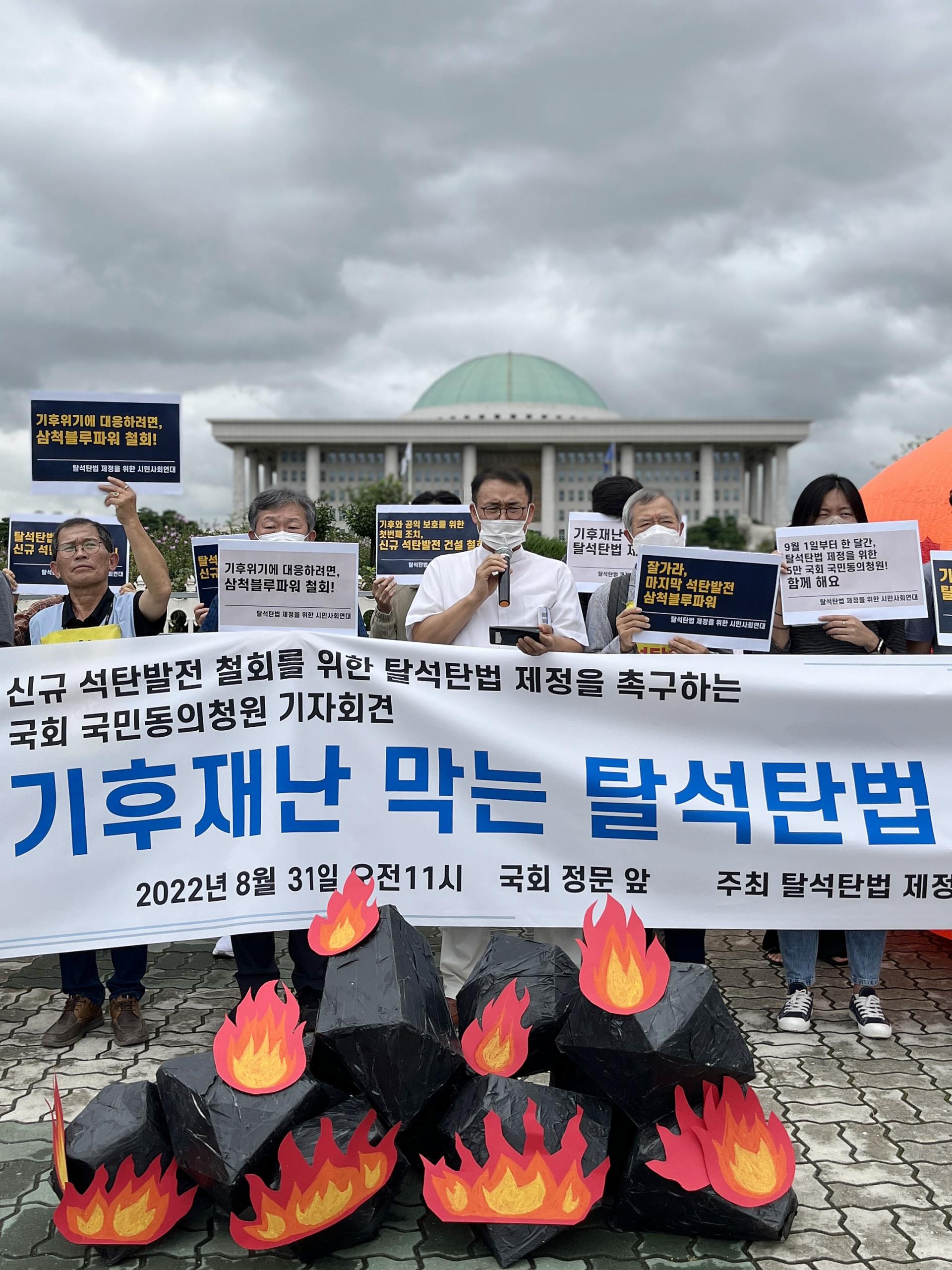 탈석탄법 제정을 위한 시민사회연대가 8월 31일 오전 서울 여의도 국회 정문 앞에서 기자회견을 열고 신규 석탄발전소 철회를 위한 탈석탄법 제정을 촉구하고 있다 ⓒ환경운동연합