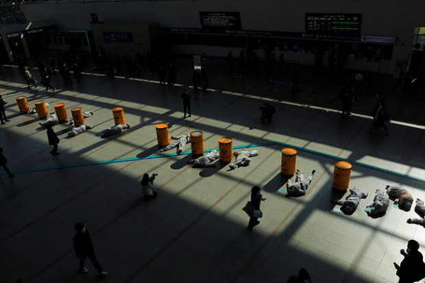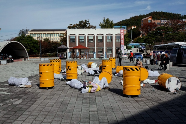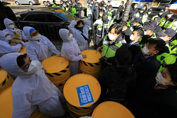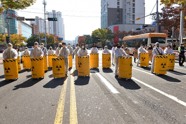 탈핵 활동가들이 모형 핵폐기물 드럼통을 싣고 부산에서 서울까지 왔다. 지난 10월 24일 부산을 출발한 <대한민국 방방곡곡 가져가라 핵폐기물 캠페인단>은 울산과 경주, 울진과 대구 그리고 영광과 대전, 세종시를 거쳐 서울에 도착했다. 서울에서는 서울역과 국회 그리고 서울대학교와 광화문을 들러 청와대 앞까지 왔다. 그러나 끝내 대통령에게 직접 청원이 가능한 물리적 권역인 청와대 분수대까지는 나아갈 수 없었다. 경찰병력의 강력한 제지 때문이었다. 핵발전소 지역에는 핵폐기물을 쌓아 두면서 ‘탈원전 정책’을 추구하는 이 정권의 수반이 있는 청와대에는 모형 핵폐기물 드럼통 하나조차 진입할 수 없었다.