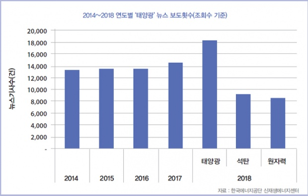 한편, 한국언론진흥재단에서 제공하는 KINDS 서비스를 통해 최근 5년 동안 ‘태양광’으로 검색어를 설정하고 뉴스 보도횟수를 분석하였다. 태양광 뉴스는 2018년 12월 14일 현재 1만8248건으로 다른 연도와 비교해서 가장 많은 건수를 기록하였다. 같은 기간 다른 에너지원인 원자력(8578건), 석탄(9332건)보다 월등히 많은 건수를 보였다. 추가로 태양광에 ‘갈등’, ‘난개발’이란 단어를 같이 검색하여 뉴스를 분석했다. 태양광+갈등의 뉴스는 2014년(231건), 2015년(201건), 2016년(2015건), 2017년(444건), 2018년(775건)으로 나타났고, 태양광+난개발 뉴스는 2014년(27건), 2015년(18건), 2016년(69건), 2017년(78건), 2018년(174건)으로 나타났다. 최근 들어 태양광에 대한 관심과 이목이 큰 폭으로 증가한 것을 알 수 있다.