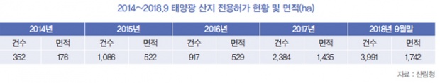 태양광 인허가가 급증한 것은 정부의 재생에너지 확대 정책의 영향도 있지만, 이른바 태양광이 ‘돈 되는 사업’이란 소문도 작용했던 것으로 보인다. 태양광 사업은 자기자본이 충분한 투자자들에게 투자처로 작용했을 뿐만 아니라 임야에 태양광 발전시설을 운영하면 잡종지로 지목 변경이 가능하기 때문에 부동산 업자나 관련 투자자들의 이목도 상당기간 집중되었다. 많은 사람들이 태양광 사업에 참여해 결과론적으로 태양광 설치가 큰 폭으로 증가했지만, 동시에 난개발과 산림 훼손, 주민 갈등 역시 크게 증가했다.