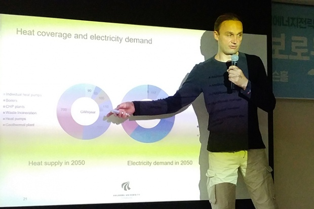 “분산형 재생에너지 시스템으로의 전환이 경제적으로나 사회적으로 훨씬 유리하다.” 한국을 찾아 덴마크 올보 시 사례를 소개하는 오스터가드 교수 ⓒ이지언