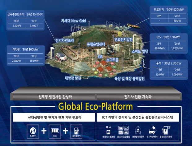 제주도는 풍부한 바람 자원으로 유명하다. 현재 제주도 풍력발전은 216MW(메가와트) 규모로, 2014년 제주도 전력소비량의 5.8퍼센트를 풍력으로 공급했다. 55MW의 태양광 발전은 전체 전력소비량의 1.1퍼센트를 생산했다. 제주도는 2030년까지 풍력과 태양광을 각각 2350MW와 1411MW로 확대하는 한편 연료전지와 에너지저장장치를 보급해 신·재생에너지로 전력을 100퍼센트 공급하겠다는 목표를 수립했다. 수송 부문에서도 차량을 모두 전기자동차로 전환해 이산화탄소 배출량을 0으로 만들겠다는 비전이다.