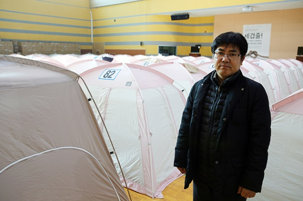“대웅파크는 처음에는 소파 진단이 나와서 안심하고 있다가 뒤늦게 지하실 기둥에 금이 가고 파손된 게 발견돼 안전진단을 해보니 위험판정이 나왔다. 그게 작년 12월 30일의 일이었고 시장의 대피명령은 31일 나왔다. 결국 우리 아파트 전 주민이 1월 1일 이곳 대피소로 왔다. 이사 갈 집 알아보는 게 쉽지 않다. 우리는 지진 후 50일이 지나서야 대피를 한 경우다. 초기에 대피한 분들이 흥해와 그 인근 전세 물량을 거개 소진했다. 게다가 우리 아파트는 임대주택보다 규모가 큰 32평 단일평형 아파트다. 전임대 지원금 1억 원 가지고는 살던 평형에 맞춰 이사 못 간다. 살던 집과 비슷한 크기로 구하자면 1억 5000만 원에서 2억 원까지 필요하다. 지원금 외에 필요한 5000만 원 이상의 돈을 구하기 힘들다. 집을 줄여 가려 해도 짐을 버리고 갈 수 없어 골치다. 아파트를 새로 지어야 하는데 조합 구성에서부터 정상적인 인허가와 시공에 3년 이상 걸린다. 이익 내기도 힘들고 시공할 땐 사회적 관심을 받아야 하는 상황이라 건설사들이 시공을 꺼린다. 그러니 시공사 잡기도 힘들다. 정부가 시공사 선정과 재건축 행정과 관련해 기간을 줄일 수 있도록 도와주길 바란다.” -박노완(46), 기쁨의 교회 대피소