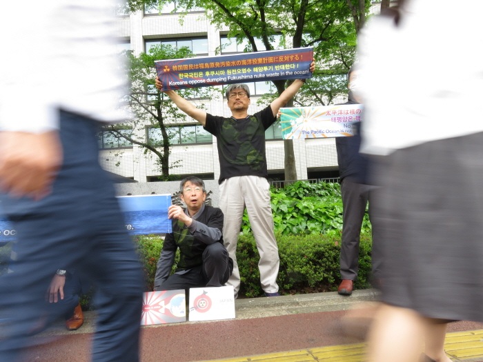 4월 24일 일본 경제산업성 청사 앞에서 후쿠시마 원전오염수 해양투기를 비판하는 시위를 벌인 한일 양국 활동가들. 일본 정부에 항의서한을 전달하고자 했으나 일본 정부는 항의서한 수령을 거부했다 ⒸKataoka Akihiko