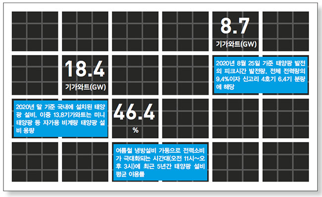 무소속 양이원영 국회의원(비례대표, 산업통상자원중소벤처기업위)은 한국전력거래소에서 제출받은 태양광 발전비중 자료를 분석한 결과, 폭염발생 등 하계 전력수급상황에서 태양광발전이 기여하는 비중이 지속적으로 증가해, 안정적인 전력수급에서 그 역할이 커지고 있다고 밝혔다. 양이 의원에 따르면 2020년 8월 25일 기준 태양광 발전의 피크시간 발전량은 8.7GW로 전체 전력량의 9.4%를 분담했던 것으로 확인됐다. 이는 최근 운영을 시작한 신고리 4호기 6.4기 분량이다. 이중 베란다 미니 태양광 등 가정이나 상업에 자가용으로 설치한 태양광 패널을 통해 생산된 발전량은 신고리 약 4.6기 발전 분량인 6.5GW로 추정했다. 베란다 미니 태양광을 비롯한 태양광 발전이 한낮 폭염대응 역할을 톡톡히 한 것이다. 여름철 전력피크 수요시간이 낮 2시에서 5시로 밀린 것도 이 때문이라는 게 양이 의원의 설명이다.