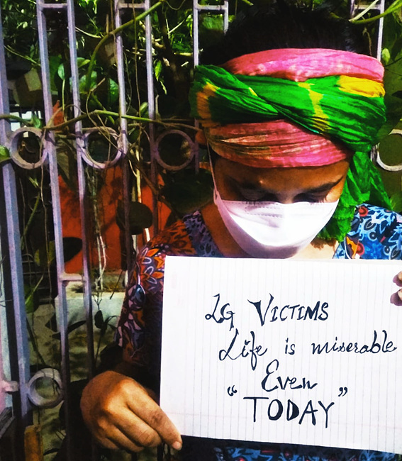 2021년 5월 6일과 7일, 사고 1주기를 맞아 인도, 한국, 홍콩, 네팔, 필리핀 등 아시아 각국의 시민사회단체들이 ‘LG화학 책임 촉구 국제항의행동’을 공동기획하고 기자회견을 열었다. 인도 사고 현지에서는 5월 6일 저녁 ‘희생자 추모 촛불캠페인’이 열려 현지 가정별로 소등하고 촛불을 켰다. 우리나라에서는 7일 12시 세종문화회관 중앙계단에서 환경보건시민센터, 환경연합 등 시민사회단체들이 희생자 추모와 LG의 책임을 촉구하는 기자회견을 열었다. 기자회견에서 이들은 ‘LG화학은 글로벌 스탠더드를 말로만 외치면서 사실상 책임 있는 대처를 방기한 채 피해자들을 방치하고 있는 현실을 반성하고 당장 적극적인 구제에 나서라’고 요구했다. 이제 11세가 된 피해자 스리산은 피해자들에게 현재 가장 중요한 것이 무엇인지에 대해 이렇게 말했다. “병원이 필요해요. 피해를 입은 아픈 사람들이 무료로 이용할 수 있는 병원이 있어야 해요.”