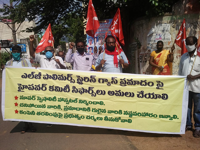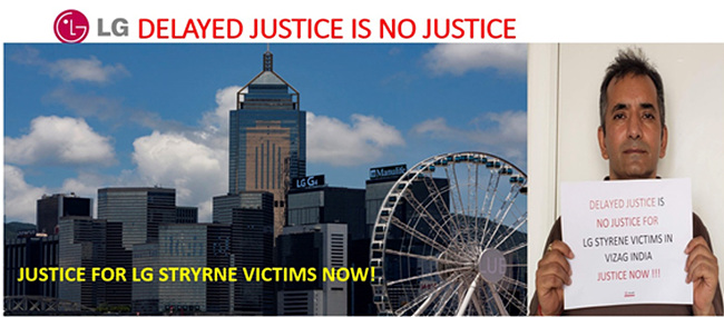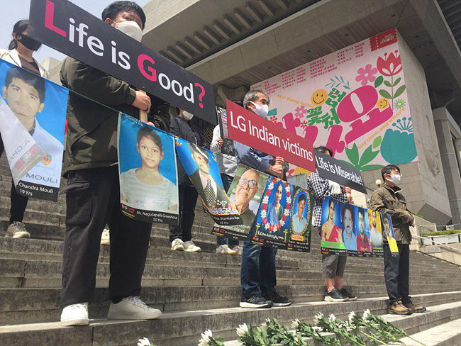 지난 5월 7일 LG폴리머스 스틸렌 가스 누출 참사 1주년을 맞아 인도 현지(비사카트남)에서 ‘공장 이전하라, 피해자에게 정의를, 병원 설립하라!’는 요구를 걸고 열린 항의집회