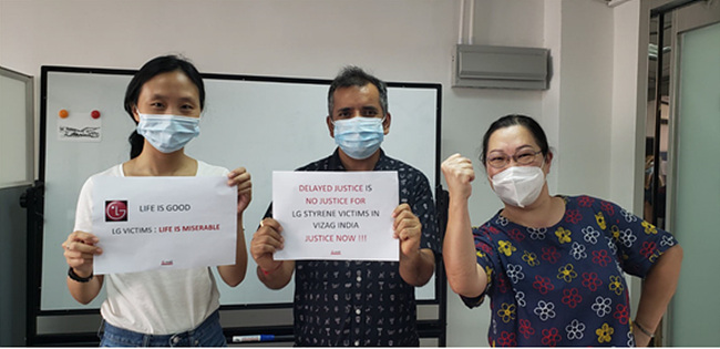 지난 5월 6~7일 네팔, 인도, 필리핀, 홍콩, 한국 시민사회에서 참사 1주년을 맞아 LG에 피해자 구제에 즉각 나서라는 요구를 담은 항의행동을 진행했다