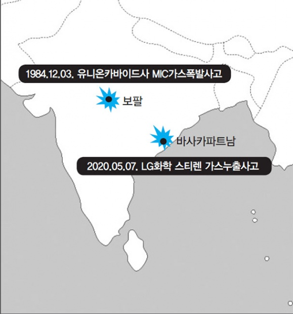 2020년 5월 7일 새벽 3시경 인도 남부의 해안도시 비사카파트남. 플라스틱 원료를 만드는 LG화학의 LG폴리머스 공장에서 스티렌(styrene) 가스가 누출되었다. 불이 난듯 자욱한 가스연기가 마을을 뒤덮으면서 아이들이 먼저 쓰러졌고 아이를 구하려던 엄마도 쓰러졌다. 오토바이를 타고 달리던 이들은 균형을 잃고 쓰러졌다. 거품을 내뿜으며 소들도 쓰러졌다. 마을을 가로지르는 작은 도랑에 정신을 잃은 이들이 굴러떨어졌다. 이 사고로 12명의 지역주민들이 사망했고 1천여 명의 사람들이 병원으로 실려갔다.