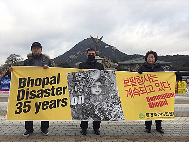 환경보건시민센터 회원들이 인도 보팔참사 35주년을 맞이해 보팔참사를 잊지 말자는 기자회견을 진행했다 사진제공 환경보건시민센터