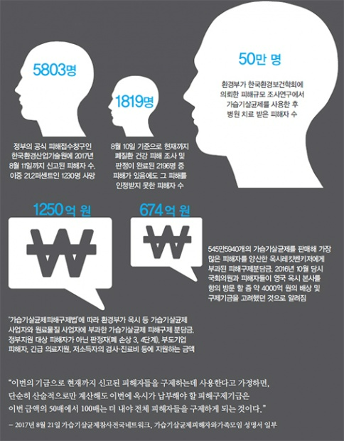 정부의 공식 피해접수창구인 한국환경산업기술원에 2017년 8월 11일까지 신고된 피해자 수. 이중 21.2퍼센트인 1230명 사망