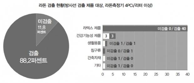 측정 결과 조사대상 283건 중 31.8퍼센트에 해당하는 90건의 제품에서 방사선(감마, 베타)이 배경선량 이상 검출되었다. 배경선량 이상 방사선이 검출된 제품 51건에 대해서 라돈측정을 추가로 진행했는데, 88.2퍼센트인 45건에서 라돈이 실내공기질 기준 이상 검출되는 것으로 나타났다.