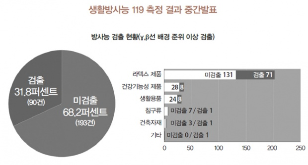 중간 조사 결과 총 107명이 환경연합에 마련된 생활방사능119 측정소에 방문해 283건의 제품들에 대해 방사선 검출 여부를 의뢰했다. 시민들이 가져온 제품의 종류로는 라텍스(매트리스, 베개 등) 제품이 전체 71.4퍼센트로 가장 많았다. 그 뒤를 이어 건강 기능성 제품이 많았는데 음이온 벨트, 팔찌, 목걸이, 온열기기, 속옷 등이 12.7퍼센트, 생활용품(주방, 욕실 등)이 11.3퍼센트를 차지했다.