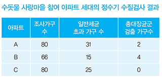 주민들이 가장 많이 사용하는 정수기 수질검사 진행했다. 조사 세대수의 34퍼센트가 식수로 부적합하다는 결과가 나왔다
