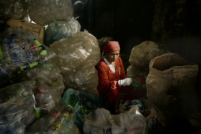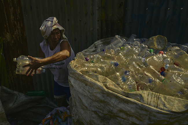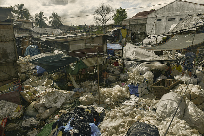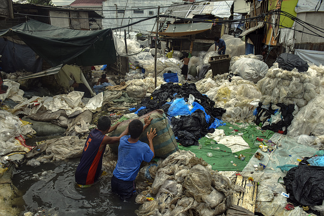 마닐라 시 교외의 야적장에서 플라스틱을 분류하는 비정규직 노동자, 2017년