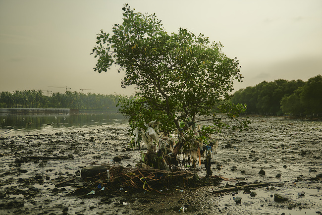 메트로 마닐라의 자치구 가운데 하나인 파라냐케 시는 서쪽으로 마닐라 만과 접해 있는데 해안선의 맹그로브 숲이 플라스틱 쓰레기로 뒤덮였다, 2018년