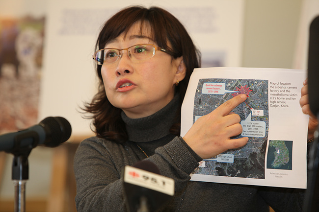 2010년 캐나다를 항의방문해 석면 수출국 캐나다가 어떻게 석면피해자를 만들고 있는지 고발 기자회견을 하는 고 이정림