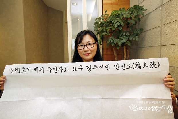 그녀를 따라 근처 카페에 자리를 잡았다. 의좋은 남매는 빵 하나씩 들고는 옆 테이블에 앉아 이 상황이 익숙한 듯 책을 펼쳐들고 읽기 시작했고 막내 주현이는 엄마 등에서 내려와 엄마 옆에서 얌전히 빵을 먹었다. 그제야 한숨을 돌리는 우 씨다. 그것도 잠시, 우 씨는 보여줄 것이 있다며 봉투에서 한지 한 장을 꺼내 펼쳐든다. 하얀 한지 위에는 ‘월성1호기 폐쇄 주민투표 요구 경주시민 만인소’라고 적혀있다. “조선시대 유생들이 잘못된 정책을 바로잡기 위해 서명을 받았던 것처럼 우리도 서명을 받고 있어요. 한 장당 100명의 서명을 받을 것인데 이것을 100장 받으면 1만 명의 서명을 받는 거예요.” 반듯한 글씨는 그녀가 직접 썼다고 한다. “이런 것을 한 번도 쓴 적이 없어요. 아이들 셋 재우고 밤마다 연습했다니까요. 정말 힘들었어요.”라며 웃는다.