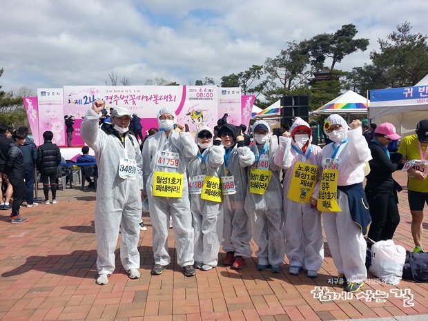 어디 온라인뿐이랴. 매주 토요일에는 경주 시내에 월성1호기 폐쇄를 요구하는 피켓 캠페인에 참여하고 지역 성당을 돌며 월성1호기 폐쇄 이유가 담긴 전단지를 나눠주는 활동도 하고 있다. 그리고 지난 4월에는 마라톤 대회에도 참가했다. “경주시내에 벚꽃마라톤 대회가 열린대요. 월성1호기를 알리는 좋은 기회가 될 것 같아서 환경연합 회원들과 의기투합했죠.” 마라톤 대회 한 달 전부터 학교 운동장을 하루 30분씩 쉬지 않고 달리며 준비를 했다고 한다. 그리고 대회 당일날 하얀색 방제복을 입고 ‘월성1호기 폐쇄’가 적힌 몸자보를 달고 10킬로미터를 달렸다. 그녀의 목표는 최대한 카메라에 많이 잡히고 시민들이 더 많이 볼 수 있도록 끝까지 달리는 것이었다. 10킬로미터를 달리는 것이 쉬운 일이 아닌데 거기에 한낮에 바람도 통하지 않는 방제복까지 입고 달리는 일은 마라톤 풀코스 완주만큼이나 힘들었을 터. 더군다나 한수원이 후원한 마라톤 대회였다. “정말 힘들었어요. 몸도 그렇고 관계자들 시선도 그렇고. 근데 완주하고 나니깐 10킬로미터는 짧대요. 다음에는 하프코스에 도전해야겠어요. 길게 뛰어야 더 많은 사람들이 보지 않겠어요?”라며 벌써부터 내년을 기대하는 눈치다.